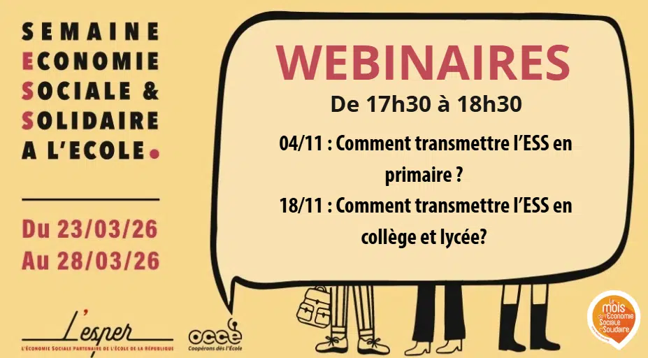 Acteur·ices de l’ESS et enseignant·es, vous souhaitez découvrir comment aborder l’économie sociale et solidaire avec les élèves ? En prévision de la 10ème édition de la Semaine de l’ESS à l’École, qui aura lieu du 23 au 28 mars 2026, L’ESPER et L’OCCE vous invitent à venir réfléchir aux manières de transmettre l’ESS en classe et présenteront des outils pédagogiques adaptés aux niveaux des élèves, à la durée de l’intervention… Un kit d’outils vous sera transmis après le webinaire.