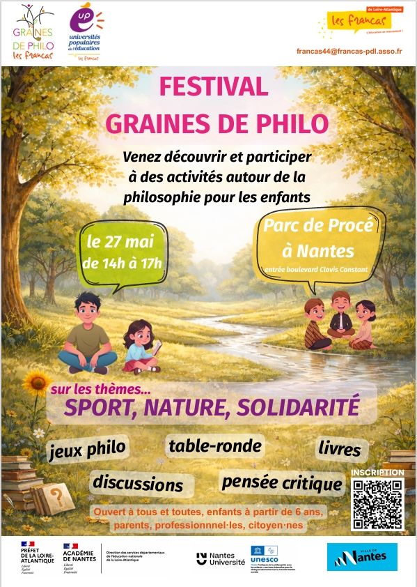 Les Francas de Loire-Atlantique sont heureux de vous inviter au Festival Graines de Philo, qui se déroulera au Parc de Procé à Nantes, le mercredi 27 mai 2026, de 14h à 17h.