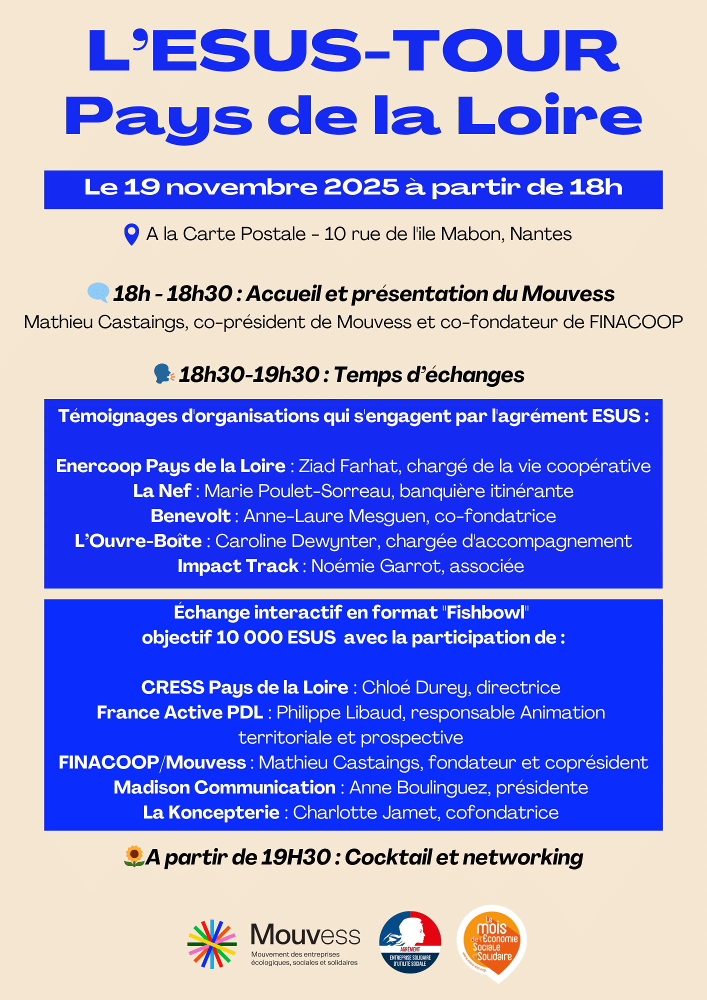 En tant que Maison des ESUS, le Mouvess a lancé l’ESUS-Tour autour d’un objectif ambitieux : promouvoir l’agrément ESUS et valoriser les structures les plus engagées partout en France pour réussir à atteindre l’objectif de 10 000 ESUS. Une nouvelle étape de l’ESUS-Tour a lieu à Nantes pour une soirée dédiée à l’engagement des entreprises par l’agrément ESUS. Venez découvrir rencontrer des structures qui ont fait le choix de s’engager à travers l’agrément ESUS et découvrir les propositions du Mouvess pour soutenir ces entreprises d’intérêt général à travers des échanges riches et des témoignages inspirants.