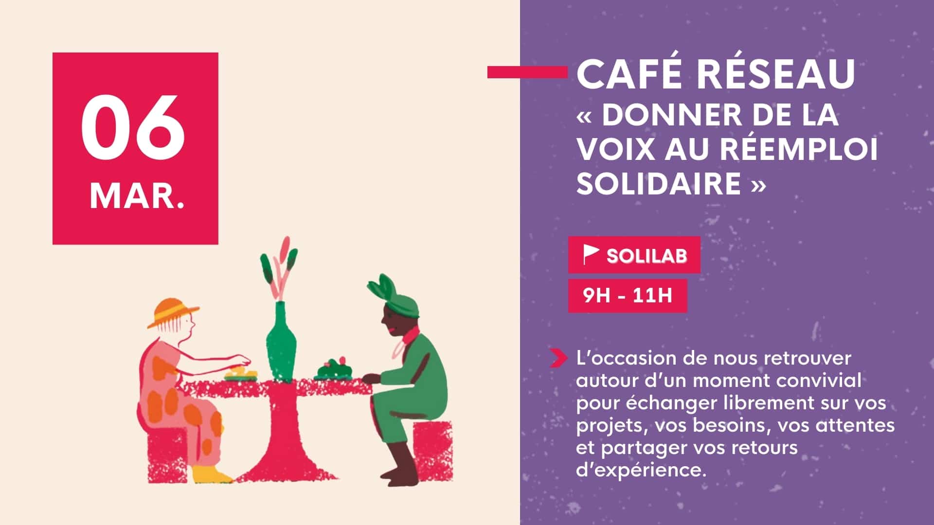 Les petits-déjeuners du réemploi sont l’occasion de nous retrouver autour d’un moment convivial pour échanger librement sur vos projets, vos besoins, vos attentes et partager vos retours d’expérience.Un temps pour créer des liens, faire émerger des idées et démarrer la journée sur une note positive et constructive ! Pour nous aussi, ces échanges sont essentiels : ils nous permettent de mieux comprendre vos enjeux, de recueillir vos attentes et d’adapter au mieux notre offre d’accompagnement.