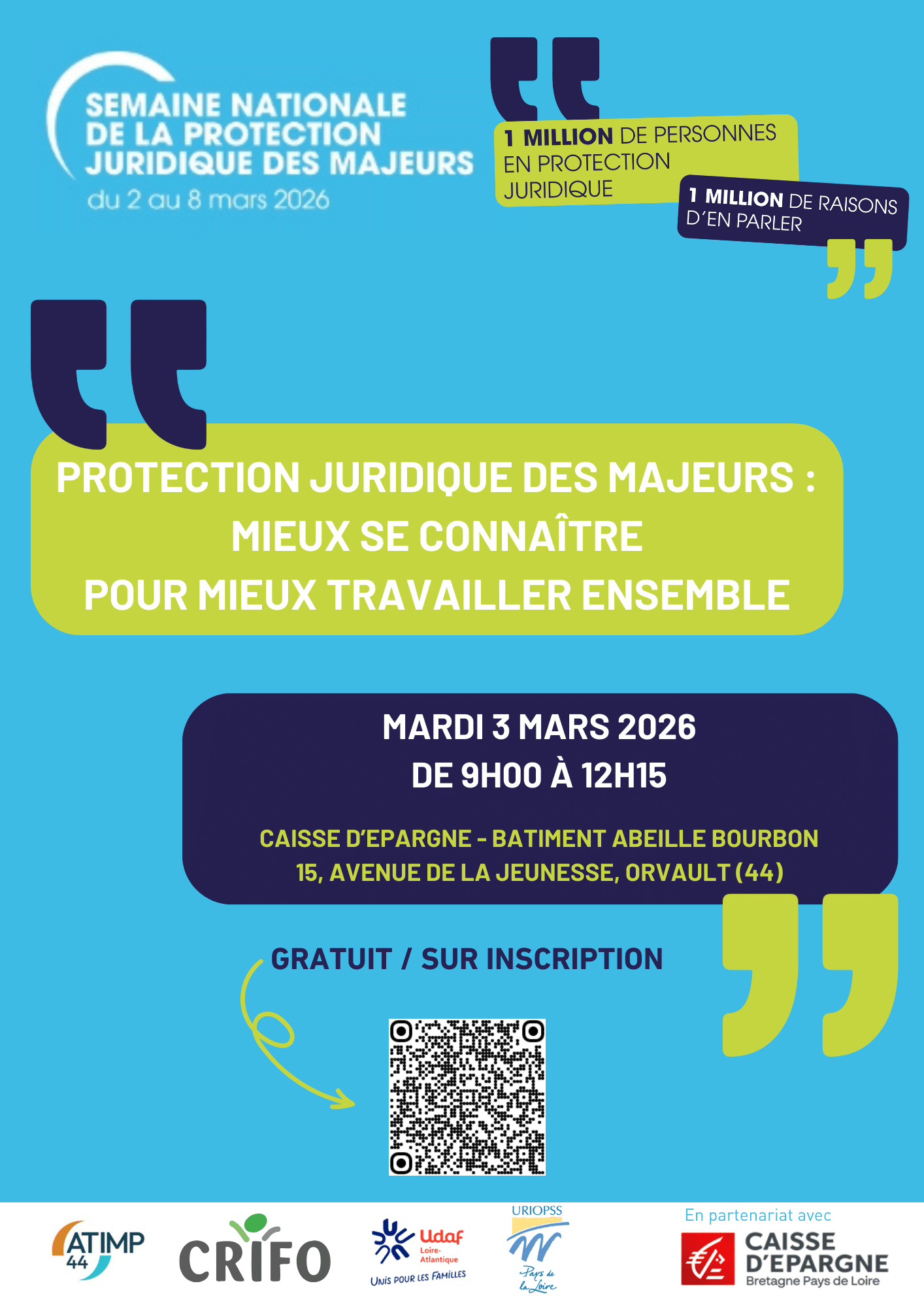A l’occasion de la 2ème Semaine Nationale de la Protection Juridique des Majeurs, à l’initiative de l’Interfédération de la PJM (FNAT, UNAF, UNAPEI), en Loire-Atlantique, l’ATIMP, la CRIFO et l’UDAF44, en partenariat avec l’Uriopss Pays de la Loire, proposent une matinée d’échanges sur la Protection Juridique des Majeurs afin de déconstruire les idées reçues et de renforcer la coopération entre acteurs au bénéfice de la participation des personnes protégées dans leurs choix quotidiens. TEMPS FORTS DE LA MATINEE : Café-débat : « Tout est compliqué et trop long avec vous ! » Croiser les regards pour dépasser les idées reçues et mieux se comprendre Ce temps d’ouverture permettra de poser le sujet, de croiser les regards sur les visions, les enjeux, les rôles de chacun et les complémentarités d’interventions, à partir de situations concrètes, évoquées par des témoignages croisés d’une personne protégée, d’une mandataire judiciaire, d’un professionnel de terrain d’un ESSMS (Etablissement et Service sociaux et médico-sociaux) et d’une direction. Ateliers participatifs Dans la continuité du café-débat, les participants seront invités à poursuivre les échanges au sein d’un des 4 ateliers participatifs proposés, centrés sur des problématiques du quotidien. Merci de formuler lors de votre inscription un choix prioritaire et un second choix. En fonction du nombre de participants par atelier, certains pourront être amenés à participer à leur second choix. 🏠 Le logement Idée reçue n°1 « La personne protégée ne choisit pas son lieu de vie » Qui décide ? Cet atelier propose d’explorer les idées reçues, les rôles de chacun, les droits en jeu et les leviers pour mieux associer la personne aux décisions concernant son logement. 💼 Le travail Idée reçue n°2 « Sous protection juridique, la personne protégée ne peut pas travailler » Un temps d’échanges pour questionner les idées reçues autour de l’emploi, clarifier les rôles MJPM/travailleurs sociaux et renforcer la prise
